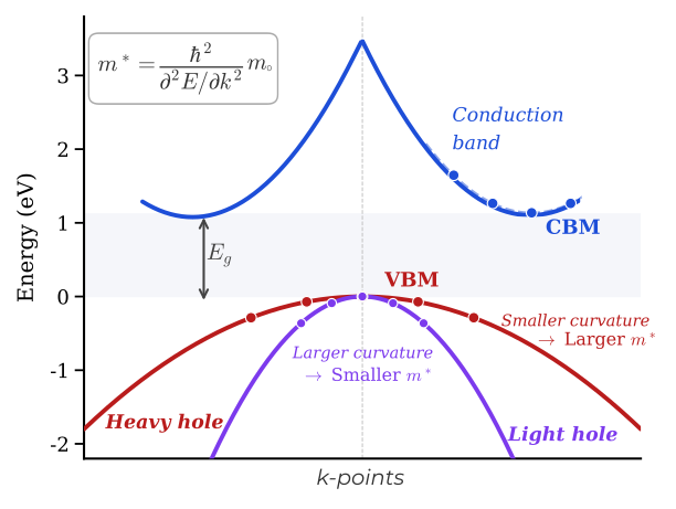 Since the effective mass is essentially related to the curvature of the dispersion relation, bands of large curvature correspond to small effective masses (light) while flatter bands are related with larger effective masses (heavier), as schematically show in Fig. 4.2.1